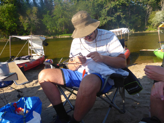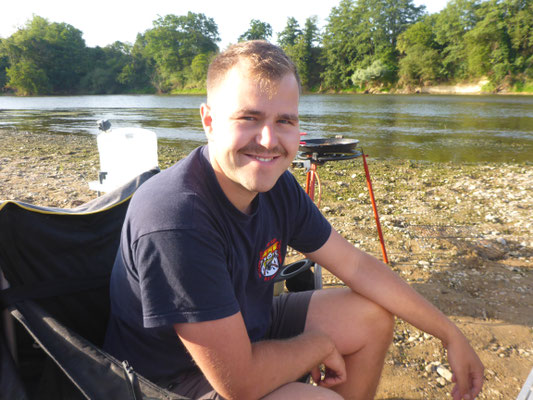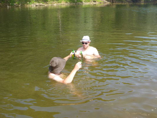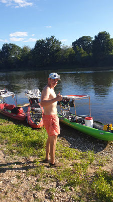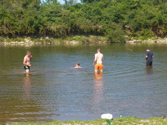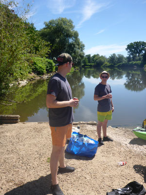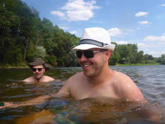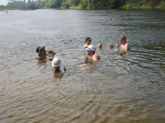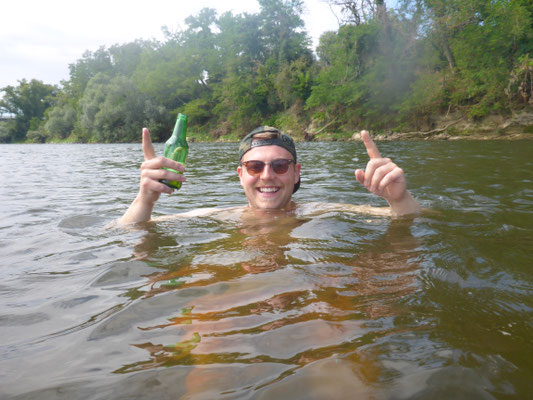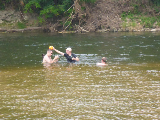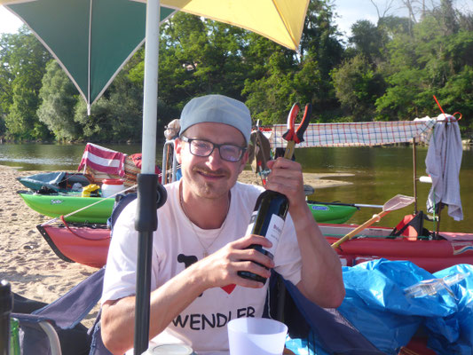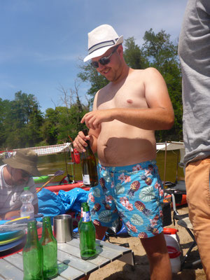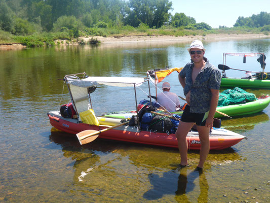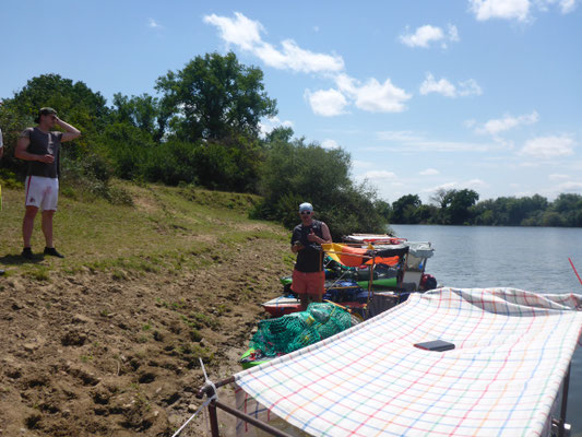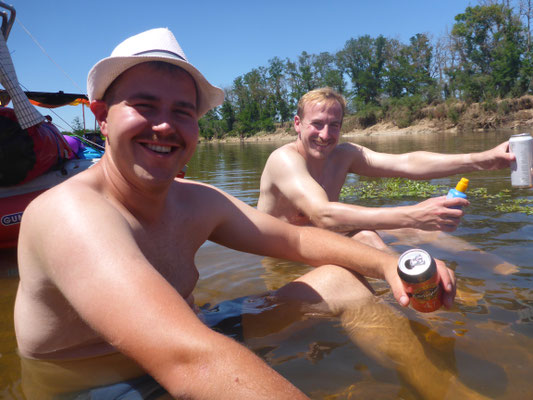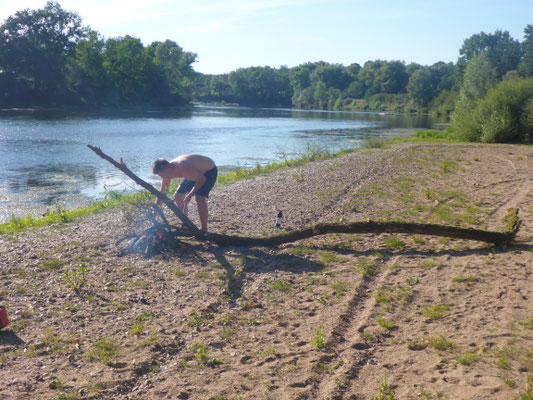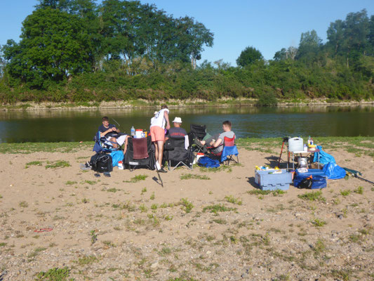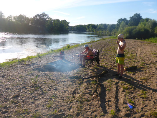 Nach einer erholsamen Nacht, wurden die Brüder bereits Morgens von der bereits hoch stehenden Sonne geweckt, die schon sehr früh einen heißen Tag ankündigte. Nach einem ausgiebigen Frühstück und dem morgendlichen Abwasch konnte sich der eigentlichen Beschäftigung des Tages gewidmet werden. Hierbei wurde festgestellt, dass die abendliche Notaktion unserer Angler tatsächliche von Erfolg gekrönt war. Den beiden war ein kleiner Wels an die Angel gegangen, den die beiden mit Stolz präsentierten. Der Fisch wurde anschließend wieder ausgesetzt. Bei bestem Wetter wurde anschließend ausgiebig in der Loire gebadet und die Sonne genossen. Durch den Nationalfeiertag in Frankreich waren wir nicht allein, sondern auch viele Franzosen nutzten den Tag zum baden und sonnen. Als zusätzlicher Zeitvertreib wurden unter den Brüdern eine Wette abgeschlossen, wie viele Tagespaddler auf der Loire vorbeikommen würden. Die Wette wurde von unserem Bruder Henni gewonnen. Um auch unsere tägliche Dosis Sport zu bekommen, ermunterte uns Matthias am Nachmittag zu einer Runde Wasserfußball, was regen Anklang fand. Zum Mittagessen gab es leckere selbstgemachte Wraps für alle und zum Abendessen wurde uns zur Abwechslung einmal eine leckere Currywurst von Max zubereitet. Beim abendlichen Beisammensein wurde noch die ein oder andere Flasche Wein getrunken und die Planung für die nächsten Tage gemacht.