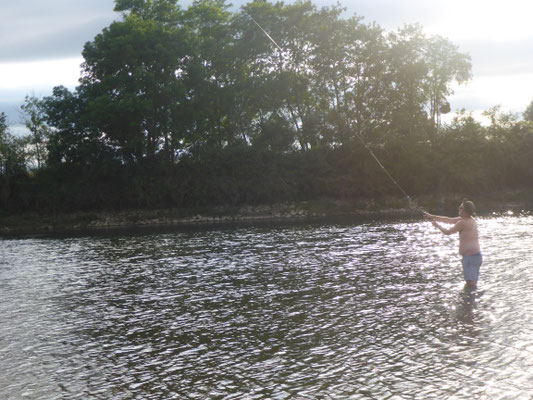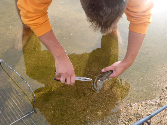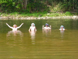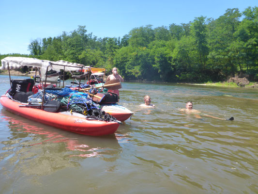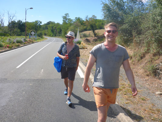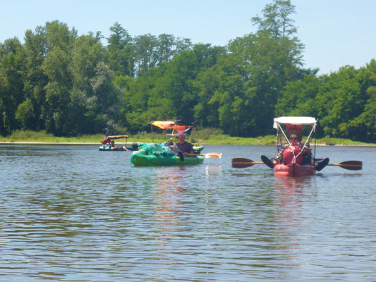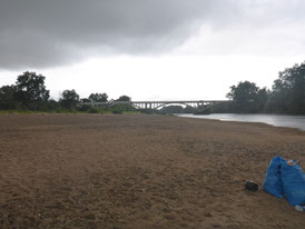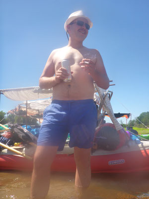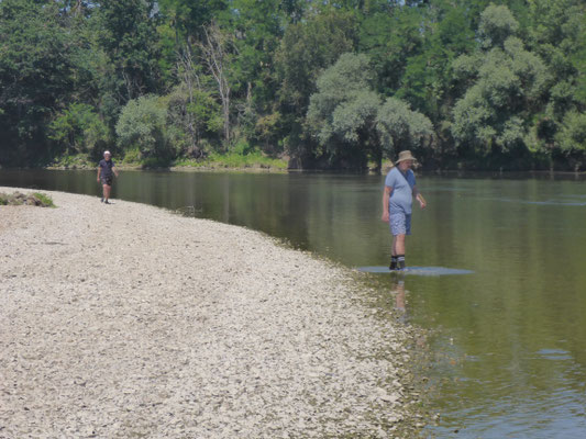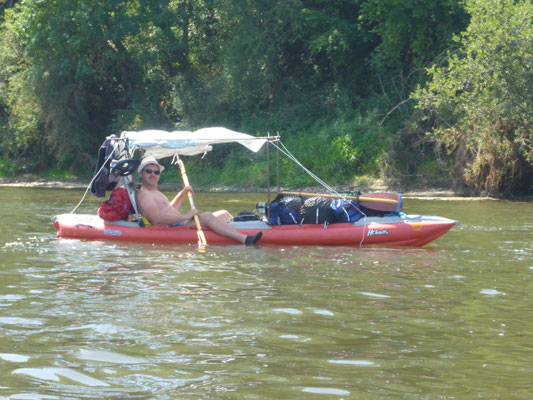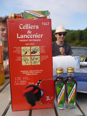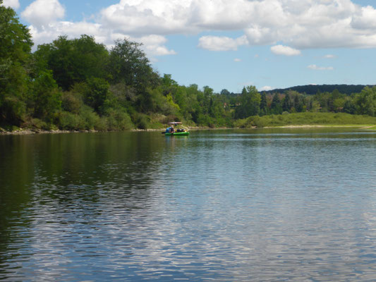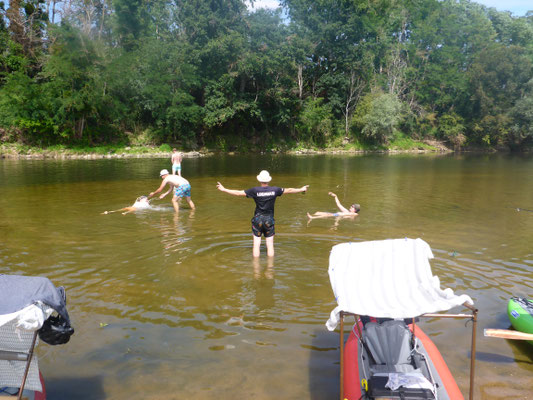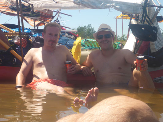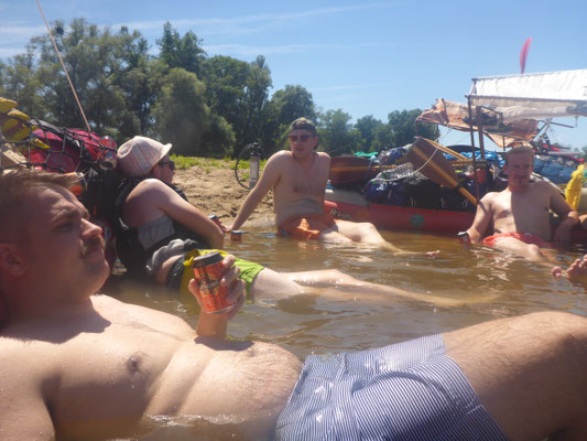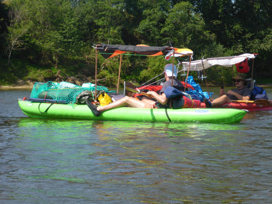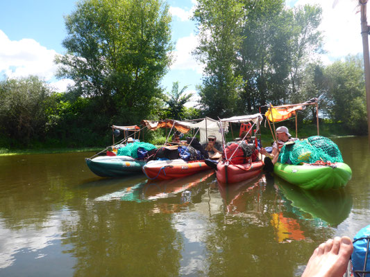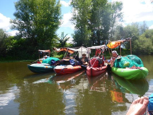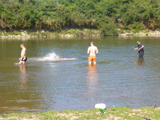 Nach einer erholsamen Nacht, wurden die Brüder bereits Morgens von der bereits hoch stehenden Sonne geweckt, die schon sehr früh einen heißen Tag ankündigte. Nach einem ausgiebigen Frühstück und dem morgendlichen Abwasch konnte sich der eigentlichen Beschäftigung des Tages gewidmet werden. Hierbei wurde festgestellt, dass die abendliche Notaktion unserer Angler tatsächliche von Erfolg gekrönt war. Den beiden war ein kleiner Wels an die Angel gegangen, den die beiden mit Stolz präsentierten. Der Fisch wurde anschließend wieder ausgesetzt. Bei bestem Wetter wurde anschließend ausgiebig in der Loire gebadet und die Sonne genossen. Durch den Nationalfeiertag in Frankreich waren wir nicht allein, sondern auch viele Franzosen nutzten den Tag zum baden und sonnen. Als zusätzlicher Zeitvertreib wurden unter den Brüdern eine Wette abgeschlossen, wie viele Tagespaddler auf der Loire vorbeikommen würden. Die Wette wurde von unserem Bruder Henni gewonnen. Um auch unsere tägliche Dosis Sport zu bekommen, ermunterte uns Matthias am Nachmittag zu einer Runde Wasserfußball, was regen Anklang fand. Zum Mittagessen gab es leckere selbstgemachte Wraps für alle und zum Abendessen wurde uns zur Abwechslung einmal eine leckere Currywurst von Max zubereitet. Beim abendlichen Beisammensein wurde noch die ein oder andere Flasche Wein getrunken und die Planung für die nächsten Tage gemacht.