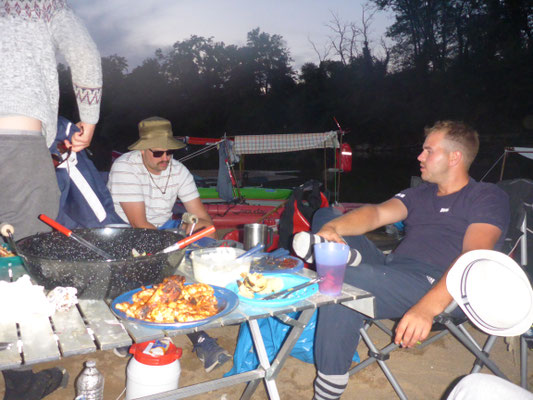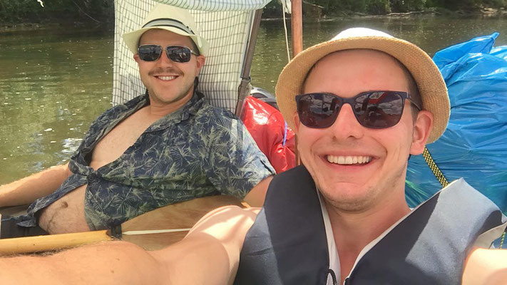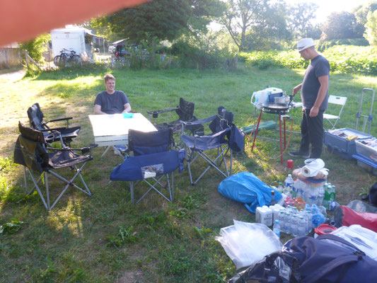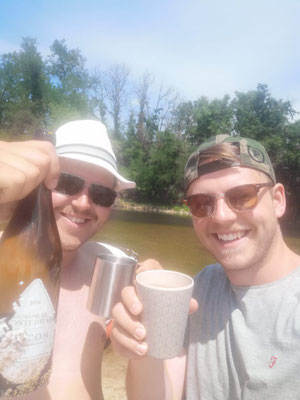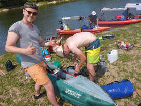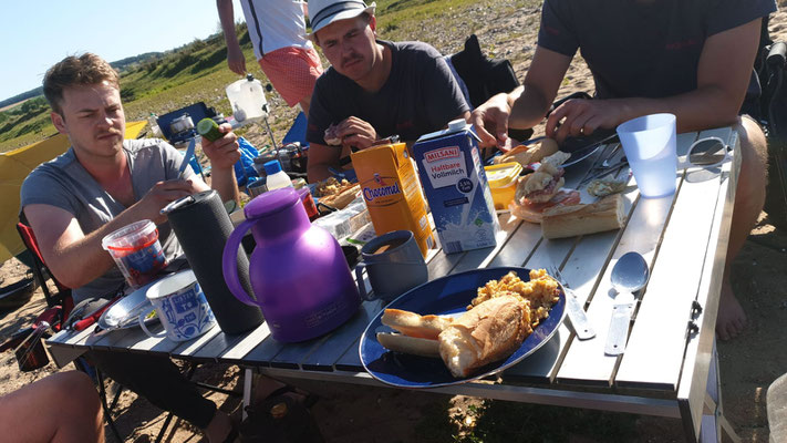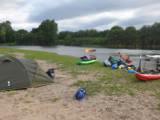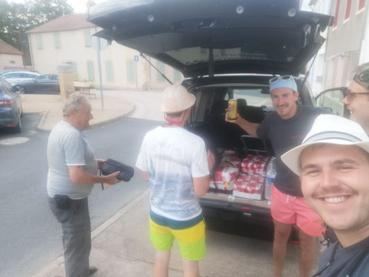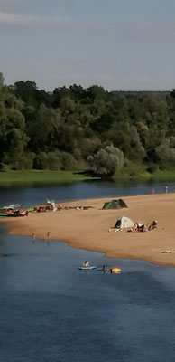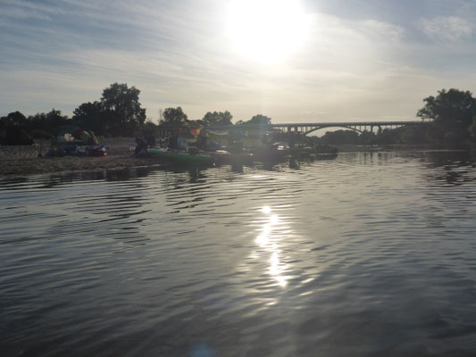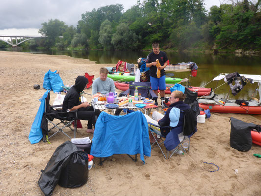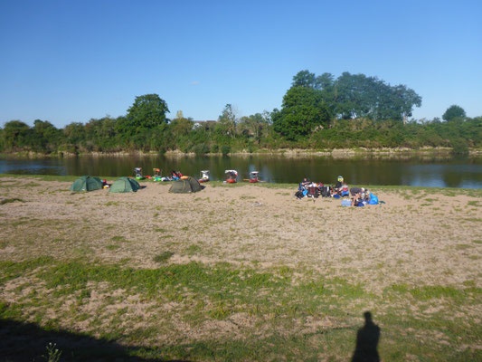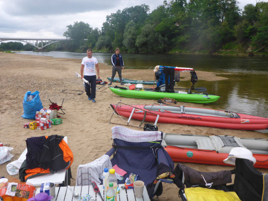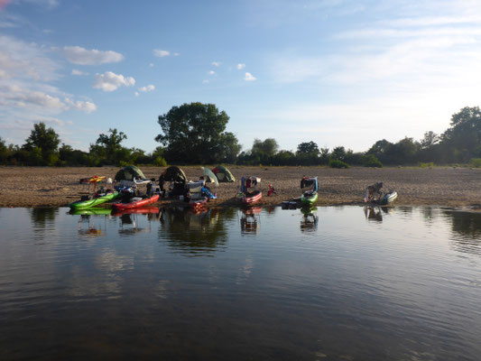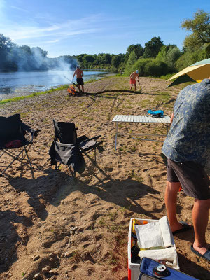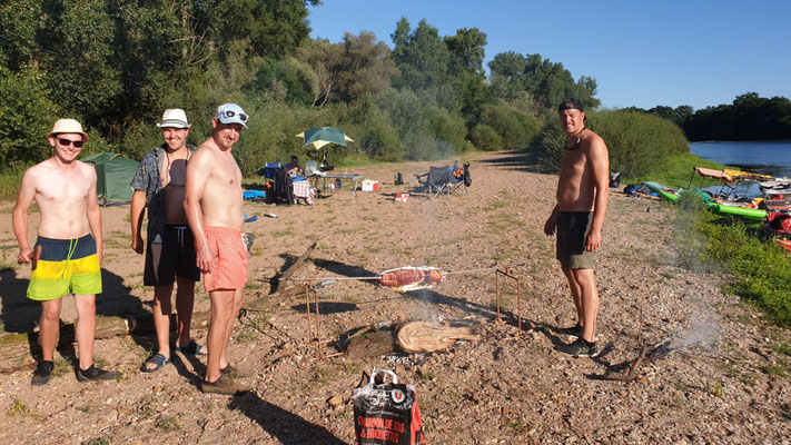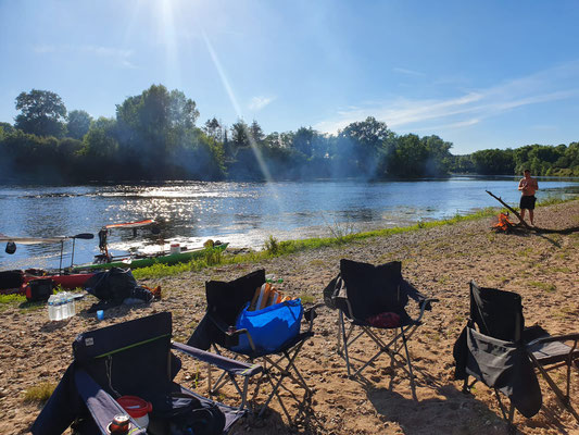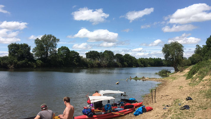 Nach anstrengenden 8 Stunden über deutsch-französische Autobahnen, sind wir am Morgen des 09.07.20 bei bestem Wetter an der wunderschönen Loire angekommen. Unser Startpunkt lag diesmal an einem kleinen wunderschönen Seitenarm der Loire. Auf einer Wiese hinter einem Campingplatz mit Wasserzugang wurde entspannt entladen und sich anschließend für ein erstes leckeres "Loirefrühstück" niedergelassen. Unser Küchenchef verwöhnte uns mit leckerem Rührei und frischen Crossaints. Passend zum perfekten Frühstück begrüßte uns Frankreich mit bestem sonnigen Wetter und angenehmen 25 Grad Celsius. Gut gestärkt war nun das Aufbauen und Packen der Boote angesagt, um möglichst zügig aufs Wasser zu kommen, um sich abzukühlen. Wie auch auf der ersten Tour ist es zu Beginn des Packens immer ein geordnetes großes Chaos, da sämtliche mitgebrachte Sachen zunächst sortiert und den Booten zugeteilt werden müssen. Nach erfolgter Aufteilung und den obligatorischen Startfotos, war es endlich soweit und wir konnten pünktlich zur Mittagshitze aufs Wasser und die ersten Paddelschläge der Tour 2020 machen. Nach den ersten anstrengenden Metern mit ordentlich Gegenwind war es Zeit für eine erste Bade- und Bierpause, die von allen Brüdern ausgiebig ausgekostet wurde, um den hohen Temperaturen (mittlerweile ca. 34 Grad) auf den Booten zu entkommen. Nach entspannten Minuten der Abkühlung wurde zunächst munter weiter gepaddelt, um am späten Nachmittag noch einmal eine kurze Bier und Snack Pause am Rande einer schönen Sandbank wahrzunehmen. Am Abend des ersten Paddeltages verwöhnte uns unser Chefkoch Hendrik mit einem leckeren Grillbuffet inklusive großem gemischtem Salat. Nach einem anstrengenden Tag und einer zuvor anstrengenden Nacht im Auto ließen wir den Abend entspannt am Ufer der Loire ausklingen und fielen satt und glücklich in unsere Zelte.