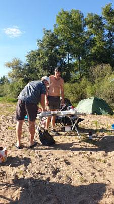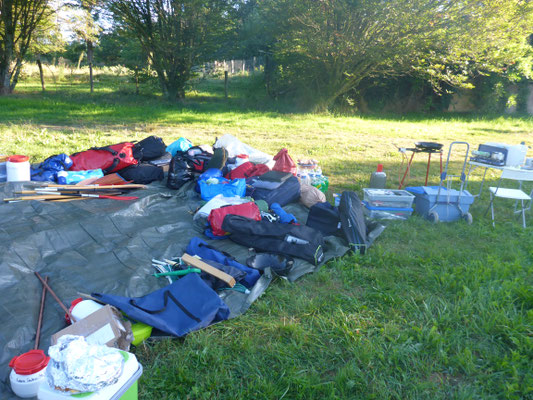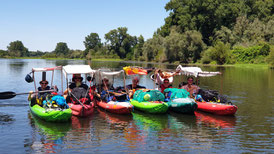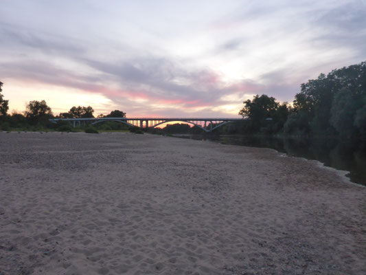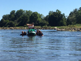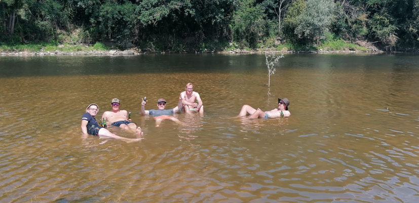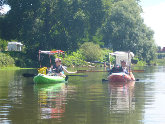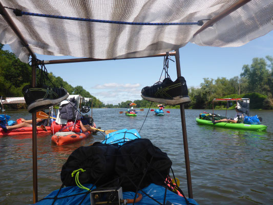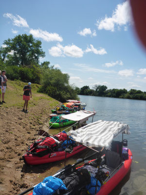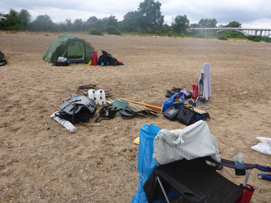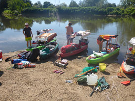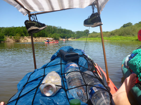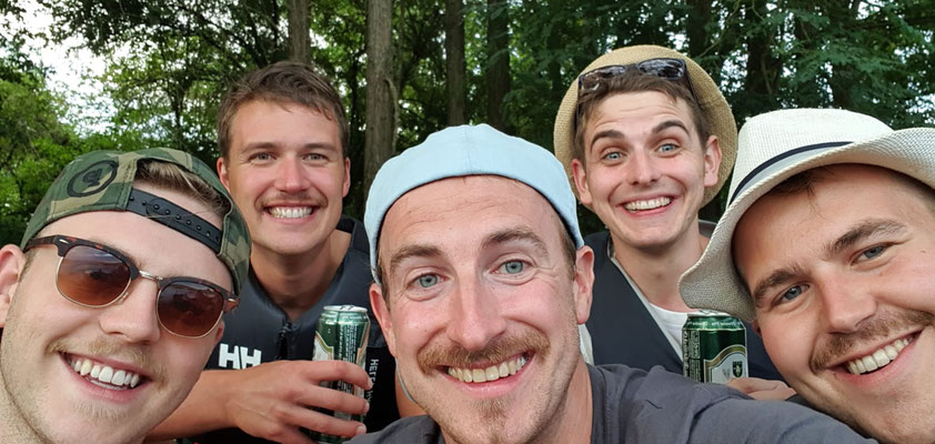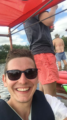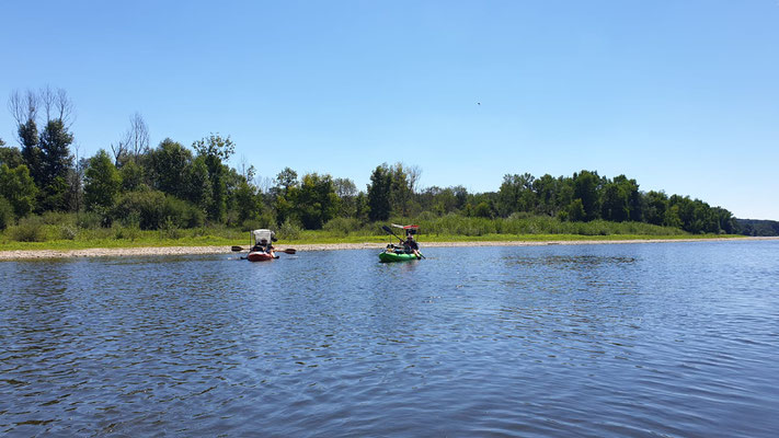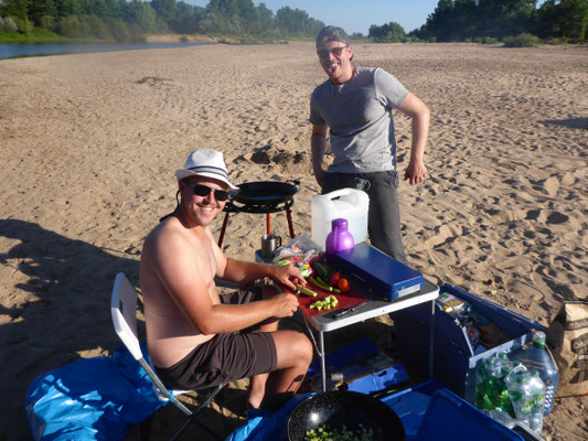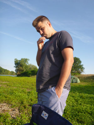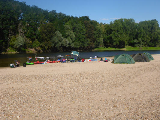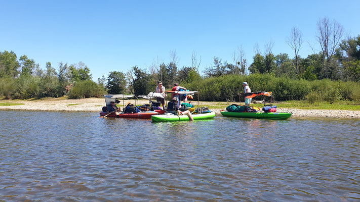 Nach anstrengenden 8 Stunden über deutsch-französische Autobahnen, sind wir am Morgen des 09.07.20 bei bestem Wetter an der wunderschönen Loire angekommen. Unser Startpunkt lag diesmal an einem kleinen wunderschönen Seitenarm der Loire. Auf einer Wiese hinter einem Campingplatz mit Wasserzugang wurde entspannt entladen und sich anschließend für ein erstes leckeres "Loirefrühstück" niedergelassen. Unser Küchenchef verwöhnte uns mit leckerem Rührei und frischen Crossaints. Passend zum perfekten Frühstück begrüßte uns Frankreich mit bestem sonnigen Wetter und angenehmen 25 Grad Celsius. Gut gestärkt war nun das Aufbauen und Packen der Boote angesagt, um möglichst zügig aufs Wasser zu kommen, um sich abzukühlen. Wie auch auf der ersten Tour ist es zu Beginn des Packens immer ein geordnetes großes Chaos, da sämtliche mitgebrachte Sachen zunächst sortiert und den Booten zugeteilt werden müssen. Nach erfolgter Aufteilung und den obligatorischen Startfotos, war es endlich soweit und wir konnten pünktlich zur Mittagshitze aufs Wasser und die ersten Paddelschläge der Tour 2020 machen. Nach den ersten anstrengenden Metern mit ordentlich Gegenwind war es Zeit für eine erste Bade- und Bierpause, die von allen Brüdern ausgiebig ausgekostet wurde, um den hohen Temperaturen (mittlerweile ca. 34 Grad) auf den Booten zu entkommen. Nach entspannten Minuten der Abkühlung wurde zunächst munter weiter gepaddelt, um am späten Nachmittag noch einmal eine kurze Bier und Snack Pause am Rande einer schönen Sandbank wahrzunehmen. Am Abend des ersten Paddeltages verwöhnte uns unser Chefkoch Hendrik mit einem leckeren Grillbuffet inklusive großem gemischtem Salat. Nach einem anstrengenden Tag und einer zuvor anstrengenden Nacht im Auto ließen wir den Abend entspannt am Ufer der Loire ausklingen und fielen satt und glücklich in unsere Zelte.