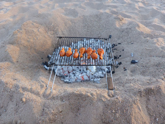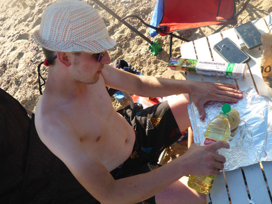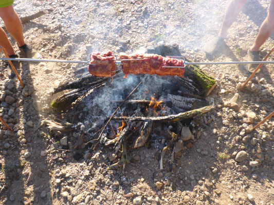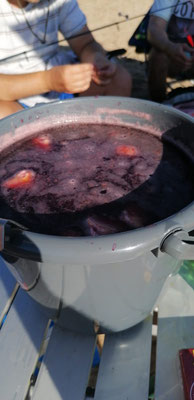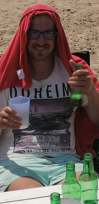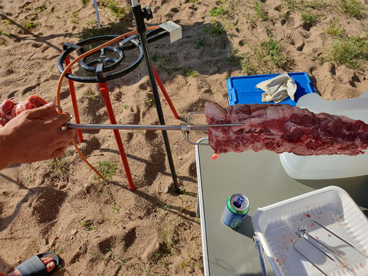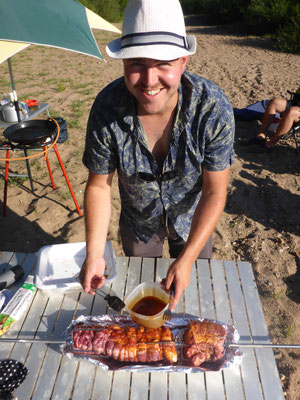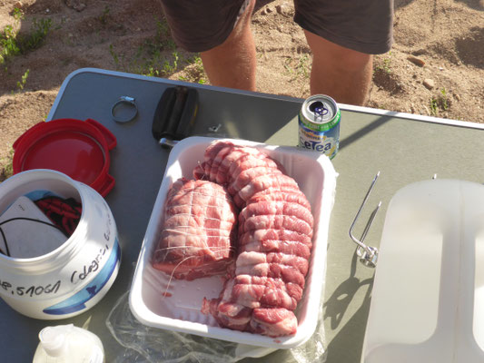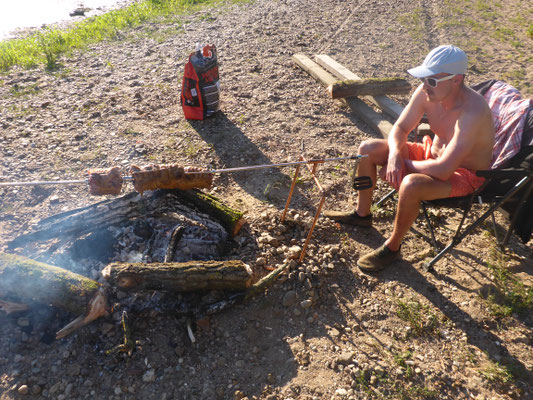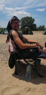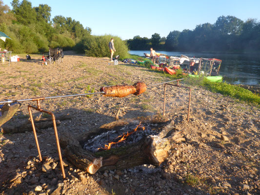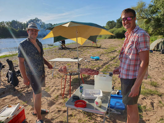 Ohne das eine Kuh einen der Brüder im Zelt überraschte, begann ein neuer sonniger Tag an der Loire. Wie auch die Tage zuvor kündigte sich bereits morgens ein weiterer heißer Tag an. Nach einem ersten Baden und einem stärkenden Frühstück, saßen wir zunächst noch eine Weile entspannt zusammen, um die nächsten Tage zu planen, als das Orakel des Matthias zuschlug. Eine einfache Frage sollte kurze Zeit später eine große Krise auslösen. Die Frage war an Bratzo gerichtet und lautete: "Warum fährst du eigentlich mit Ehering, keine Angst den zu verlieren?". Die Frage wurde mit einem lockeren dummen Spruch abgewiegelt. Kurze Zeit später jedoch war der Ring weg und mit dem Ring auch die Lockerheit bei Bratzo. Kurzerhand wurde das gesamte Lager auf links gedreht, um den Ring wiederzufinden. Die Suchaktion mündete darin, dass das Küchensieb umfunktioniert wurde und der umliegende Sand ausgiebig gesiebt wurde. Diese Aktion führte schlussendlich zum Erfolg und nach ca. 1 Stunde der Suche konnte Bratzo den Ring wieder sicher verstauen. Erleichtert konnten nun die Boote gepackt und für den Tag bereit gemacht werden. Doch das nächste Problem ließ nicht lange auf sich warten. Leon's Boot hatte über Nacht einiges an Luft verloren, sodass zunächst das Flickzeug her musste, um die undichte Stelle auszubessern. Nach einigen Versuchen gelang es unserem Techniker Max, die undichte Stelle an einem Ventil mit einem Kümmerling, einem Stück Holz und sehr viel Panzerband zu schließen. Ja, ihr lest richtig, ein Kümmerling. Wie das genau funktioniert hat, können wir euch auch nicht sagen, aber manchmal muss eben improvisiert werden. Bestens gelaunt konnte es dann endlich losgehen. Durch die vergangenen heißen Tage mussten einige der Brüder provisorische Schattentücher für Arme und Beine bauen, um die bereits gereizte Haut zu schützen. Trotzdem ließen wir uns den Spaß nicht nehmen und unser DJ der guten Laune unterhielt uns mit gesungenen Bestsellern und selbst erfundenen Liedern, wie dem Titel im Morgenland der Rosen. Der Tag und somit auch wir Brüder trieben auf unseren Dschunken entspannt durch die Mittagshitze bis wir an einer schönen Sandbank vorbei kamen, wo wir kurzerhand entschieden halt zu machen und unser Lager aufzustellen. Unser Chefkoch hatte sich für den Abend einen besonderen Leckerbissen vorgenommen, sodass Leon, Henni und Thomas losliefen, um die letzten Zutaten im nahe gelegenen Ort zu besorgen. Im Ort angekommen, mussten die Brüder leider feststellen, dass der Ort keinen Supermarkt besaß. Somit musste kurzerhand wieder auf ein Taxi zurückgegriffen werden. Da durch die französischen Corona-Bestimmungen immer nur ein Fahrgast mitfahren durfte, wurde Thomas ausgeschickt, die Waren zu besorgen. Im 25km entfernten Supermarkt wurde der Bruder fündig und kam mit einem leckeren 2,5 kg schweren Rollbraten inklusiver Beilagen zurück. Auch hier können wir wieder nur sagen, dass die Franzosen ein sehr hilfsbereites Völkchen sind. Die Taxifahrerin wartete 25 Minuten kostenlos vor dem Supermarkt und fuhr unseren Bruder dann zurück. Aber zurück zum Essen. Die Zeit des vorbereiteten Hähnchengrills hatte geschlagen. Nach einigen Vorbereitungen, spießten Henni und Thomas den Braten auf und legten ihn in die von Max vorbereiteten Aufnahmen am Feuer. Nun hieß es Warten und fleißig drehen. In der Zwischenzeit wurden uns von unserem Chefkoch leckere kleine Häppchen gereicht und wir tranken in der Abendsonne Frankreichs ein leckeres Glas Wein oder Bier. Matthias und Bratzo versuchten währenddessen weiterhin ihre Angelkünste unter Beweis zu stellen, was leider nicht von Erfolg gekrönt war. Nach ca. 1 Stunde war der Braten verzehrbereit und wurde von unserem Chefkoch mit leckeren geschmorten Zwiebeln, Baguette und frischem Salat angerichtet. Ein Festmahl!!! Der Rest des Abends verlief sehr gesellig und gemütlich, bevor man entspannt ins Bett fiel.