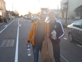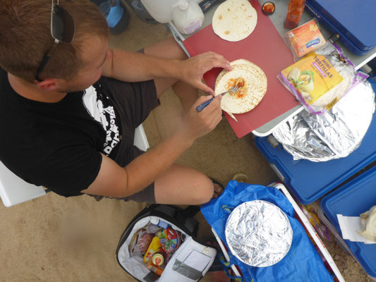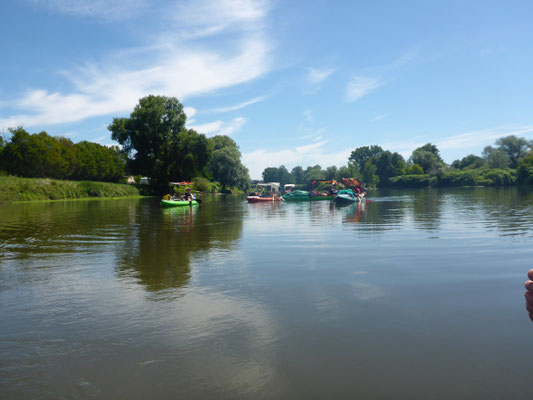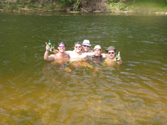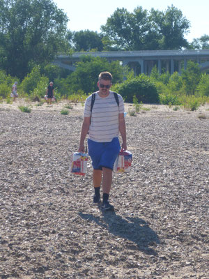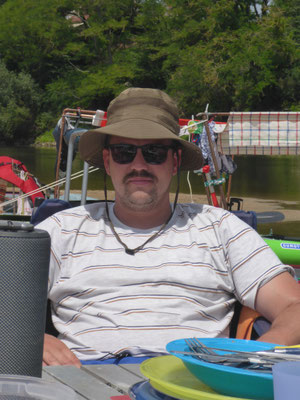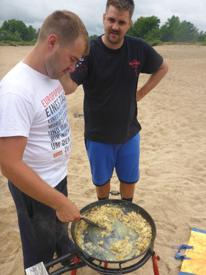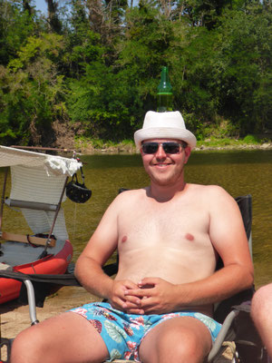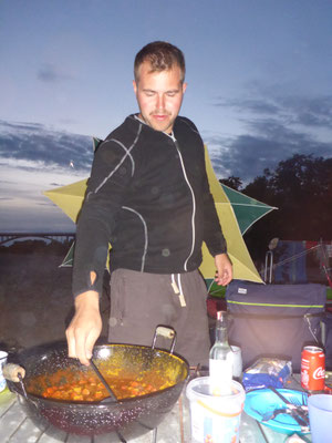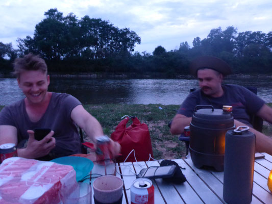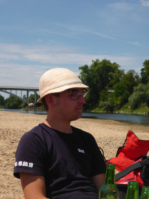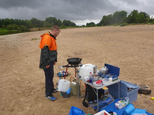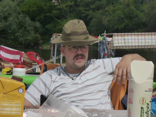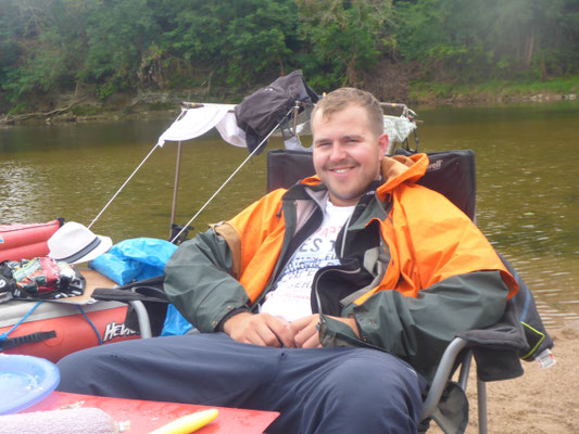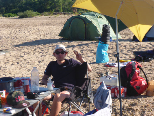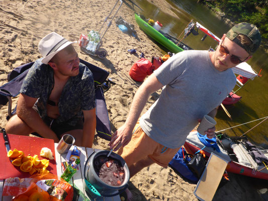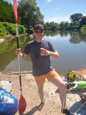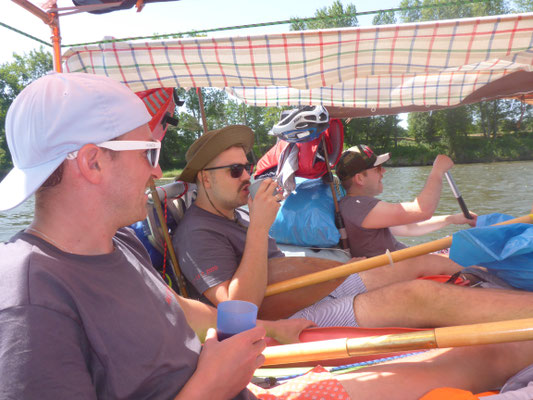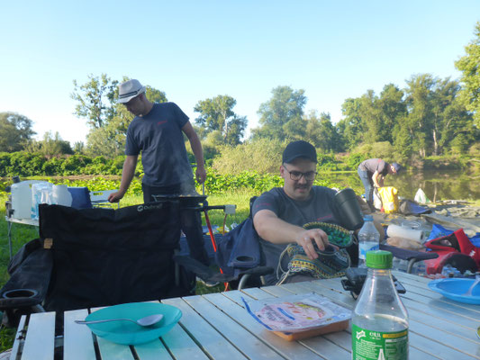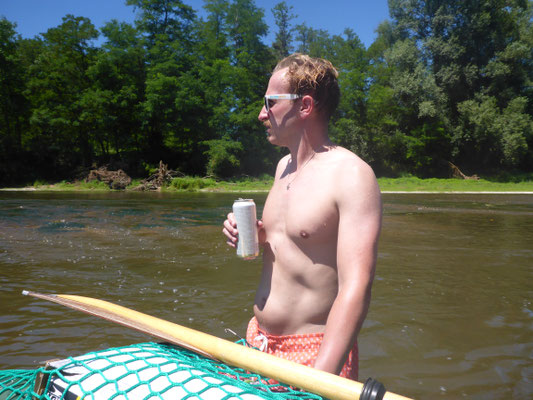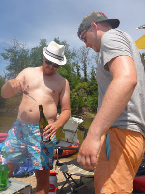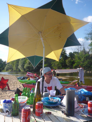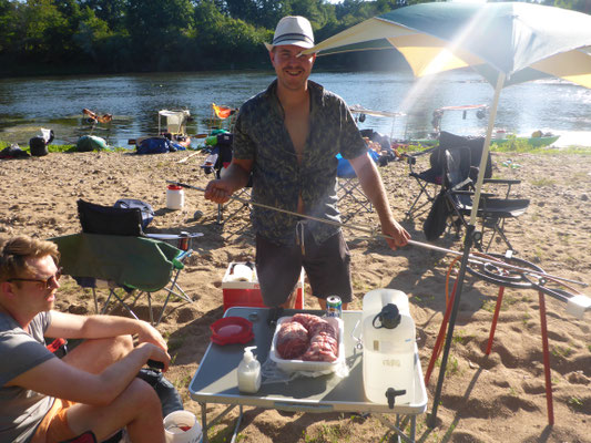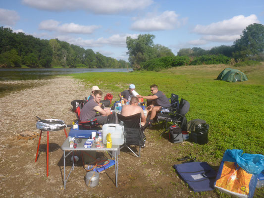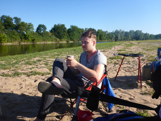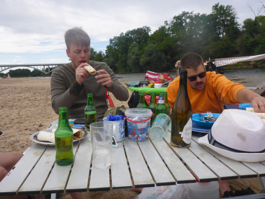 Geweckt von den Klängen der Natur, hauptsächlich kleinere Vögel, die enorm viel Krach machen, und Kühen auf unserer Sandbank, begannen alle Brüder den nächsten Morgen mehr oder weniger motiviert. Nachdem jedoch die letzte Müdigkeit durch ein erfrischendes Bad in der Loire vertrieben wurde, konnten wir gemeinsam in der Morgensonne und bei bestem Blick auf die Loire frühstücken. Wie immer konnten wir uns auf unseren Chefkoch verlassen, der uns mit allerlei Leckerbissen zu einem perfekten Start in den Tag verhalf. Munter und fröhlich ging es somit für alle Brüder kurz darauf auf die zweite Etappe der Tour. Bei reichlich Gegenwind, aber bestem Sonnenschein und heißen Temperaturen paddelten wir los. Der Tag war vor allem dadurch geprägt das alle sehr stark paddeln mussten, um den niedrigen Wasserständen und dem Gegenwind zu trotzen. Einmal aufgehört zu paddeln, trieben die Boote eher rückwärts als vorwärts. Dennoch ließen wir uns den Spaß nicht nehmen und paddelten fröhlich bis zur Mittagsstunde, um uns an einem steilen Ufer einen der leckeren und mittlerweile berüchtigten Loireburger schmecken zu lassen. Hier nun auch einmal das Rezept zum nachkochen: Ein Baguette vom Vortag (mit Glück ein frisches), Schmierkäse oder Grillsoßen, Grillfleisch vom Vortag oder leckerer Aufschnitt und ganz wichtig ein bis zwei Scheiben Scheiblettenkäse. Ihr glaubt das schmeckt nicht...? Dann probiert das mal, wenn ihr vorher 2-3 Stunden gepaddelt seid. Wir können euch sagen, es ist der HAMMER!!! Nach 1-2 weiteren Stunden auf dem Wasser, entschieden wir auf einer schönen Sandbank halt zu machen und unser Nachtlager aufzuschlagen. Nach kurzer Rücksprache mit dem Bauern, dem diese Wiese gehörte, konnten wir unsere Zelte aufschlagen. Die meisten Bauern sind, was das angeht, relativ entspannt, solange die Wiese danach wieder so aussieht wie vorher. Einziges Risiko ist, dass am nächsten Morgen eine Kuh ins Zelt schaut. :) Nach kurzer Beratschlagung entschieden wir uns aufzuteilen, sodass noch eine schnelle Einkaufstour möglich war. Max, Henni, Matthias und Leon wurden losgeschickt, um die nötigen Sachen einzukaufen. Thomas und Bratzo bauten in der Zeit das Lager auf. Nach getaner Arbeit positionierte sich unser Genießerbruder am Ufer, um entspannt bei einem Bier die Angel auszulegen und den Abend zu genießen. Das Bild dazu findet ihr weiter unten. In der Zwischenzeit erlebten die einkaufenden Brüder eine Taxifahrt der besonderen Art. Da der Weg sehr lang war und die Brüder schon sehr erschöpft vom Paddeln (...wen lüge ich hier an..., die Jungs waren einfach faul), organisierten Sie sich für die Rückfahrt ein Taxi. Ein sehr netter Taxifahrer kutschierte die Brüder also zur Sandbank zurück, wo die Lebensmittel anschließend nur noch mit Hilfe eines Bootes übergesetzt werden mussten. Nach einem leckeren gemeinsamen Abendessen, entzündeten wir noch ein kleines Lagerfeuer und saßen bis spät Abends gemeinsam zusammen, um den Tag Revue passieren zu lassen.