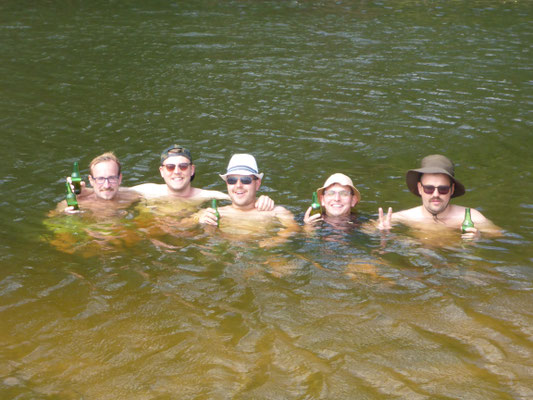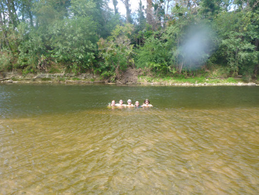 Etappe 4 der Tour sollte für alle beteiligten ein spannender und abwechslungsreicher Tag werden. Nach einem entspannten Frühstück und den üblichen morgendlichen Ritualen, ging es relativ zügig aufs Wasser. Bereits nach wenigen Metern begegneten wir einem netten Pärchen, welches ein paar Meter neben uns blieb und unsere Geschichte und unsere Erfahrungen hören wollte. Nach einigen Erklärungen verabschiedeten wir uns und waren wieder für uns. Nur wenige Meter weiter, begannen die Stromschnellen, die unser Navigator uns für den Tag prophezeit hatte. Unser Orakel Matthias hatte bereits zum Frühstück die These aufgestellt, dass er heute nicht kentern würde (ob das richtig war, erfahrt ihr später). Aufgrund des niedrigen Wassers, konnten wir die ersten Stromschnellen nicht durchfahren, sondern mussten die Boote langsam und vorsichtig zwischen den Steinen durchtreideln , wobei das Boot an einer Bootsschnur vorsichtig um die Steine bewegt wird. Nach der ersten Engstelle stiegen wir wieder ein und fuhren weiter. Für den Rest des Tages wurde das Wort "Ockenalarm" jedoch zum geflügelten Wort. Bei Ocken handelt es sich um Große Steine, die nur knapp unter der Wasseroberfläche liegen und somit eine Gefahr für die Bootsrümpfe darstellen. Um nicht aufzusetzen, wird bei jeder Sichtung laut Ockenalarm oder Vorsicht gerufen. Zur Mittagszeit trafen wir wieder auf das Ehepaar des Morgens, welches ebenfalls mit dem Kanu unterwegs war. Hier entstand auch unser erstes gemeinsames Gruppenbild auf dem Wasser. Nach einer kurzen Stärkung durch unseren Chefkoch, kamen wir wenige Meter weiter an eine weitere nicht fahrbare Stromschnelle. Nach ausgiebiger Begehung der Engstelle wurde entschieden die Boote durch die Engstelle zu tragen und erst nach der Engstelle wieder selbst zu fahren. Somit begann der anstrengende Teil des Tages. Alle Boote mussten in Teamarbeit etappenweise über die Engstelle getragen werden. Leider gibt es hiervon keine Bilder, beim nächsten Mal liefern wir diese nach, um ein besseres Verständnis des anspruchsvollen Manövers zu vermitteln. Am Ende der Engstelle war der Plan, die Boote wieder zu besteigen und einzeln durch die letzte Stromschnellen der Kurve zu fahren. Unser Bruder Thomas machte den Anfang und wurde von den anderen Brüdern in der Engstelle positioniert und durchfuhr die Kurve ohne größere Probleme. Auch Henni und Bratzo schafften die Kurve mit Hilfe der Brüder. Unser Bruder Max wurde leider durch die Wasserkraft mit seinem Boot an einen Felsen getrieben und kenterte. Mit Hilfe der Kräfte aller konnten jedoch das Boot, unser Bruder und seine Sachen ohne größere Blessuren oder Verletzungen ans Ufer gebracht werden. Bei Leons angeschlagenem Boot entschieden wir das Boot durchzuschwimmen. Hierbei zogen wir uns mit 5 Brüdern unsere Sicherheitswesten an und griffen das Boot rechts und links, um es durch die Stromschnelle zu manövrieren. Wie ihr sicherlich bemerkt habt, fehlt noch unser sportlichster Bruder und unser Orakel Matthias. Wie ihr euch denken könnt, hat das Orakel am Morgen nicht recht gehabt, auch er kenterte in der Stromschnelle und musste sich anschließend einige dumme Sprüche anhören. Das wichtigste war jedoch, dass alle heil und unversehrt Abends im Lager ankamen. Zum krönenden Abschluss des Tages kreierte unser Chefkoch eine leckere Restepfanne, die mit Käse überbacken, bei allen zu leer gefegten Tellern und vollen Bäuchen führte. Beim abendlichen Wein und im Schein mehrerer Fackeln konnten die Brüder spät Nachts noch den unglaublichen Sternenhimmel über Frankreich beobachten. Durch fehlende Lichtquellen waren die Sterne unglaublich klar und hell zu sehen.